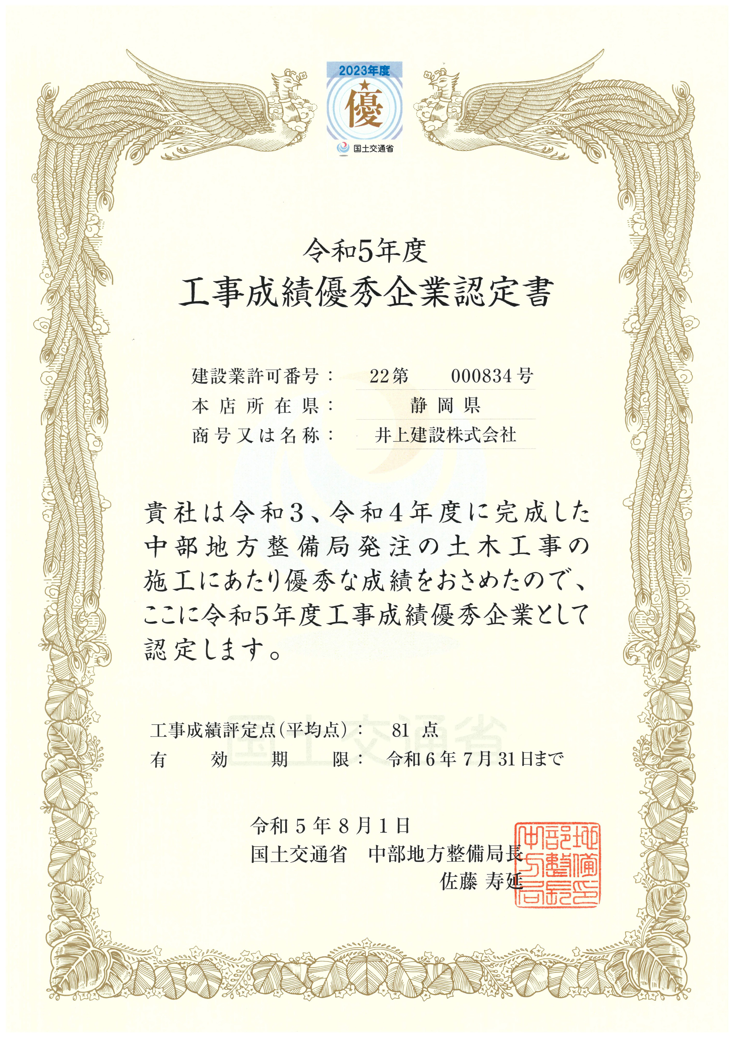 令和5年8月 令和3年・4年度 完成土木工事 国土交通省 令和5年度工事成績優秀企業認定