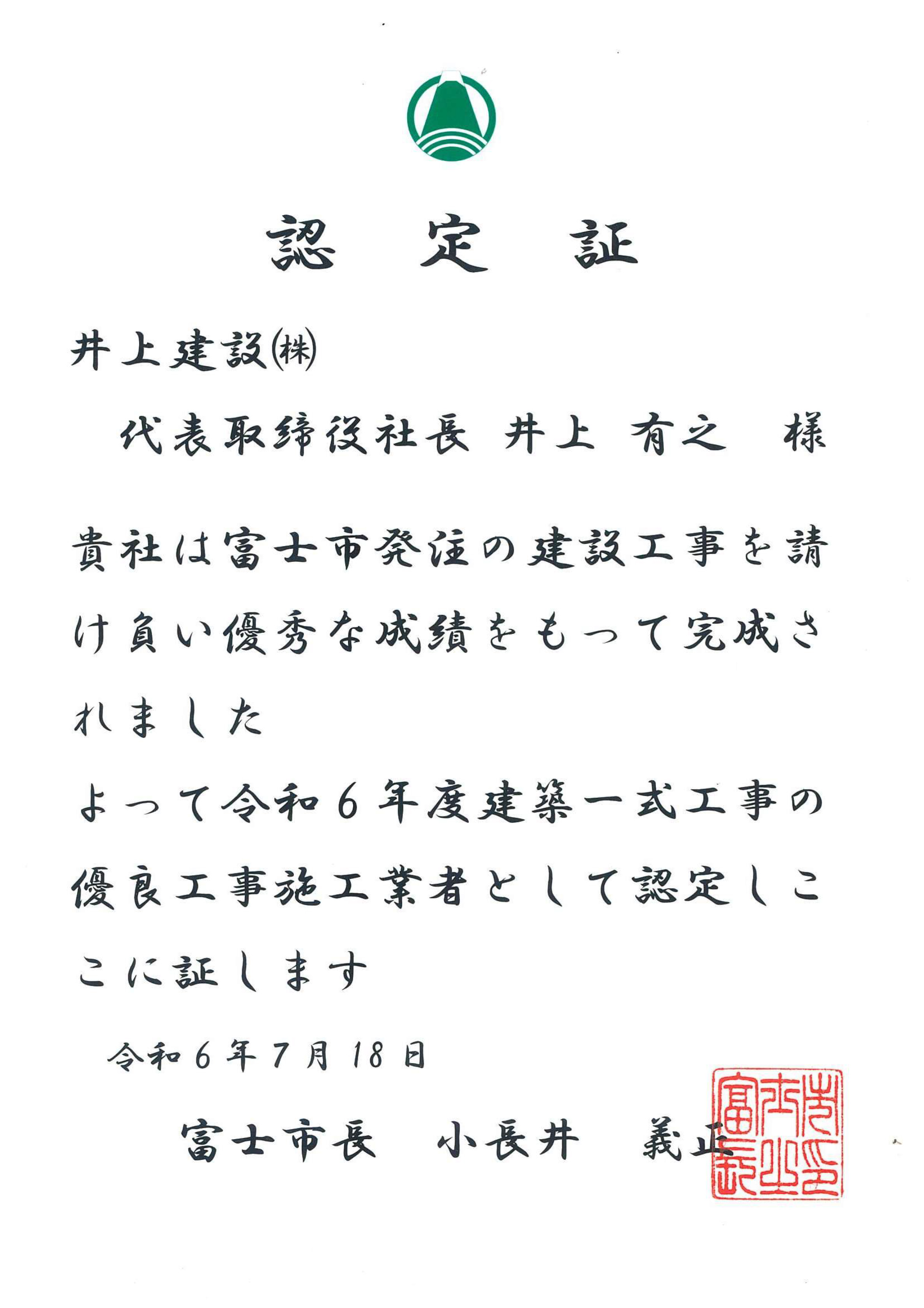 令和6年7月 令和5年度 建築一式工事 富士市 令和6年度建築一式優良業者認定