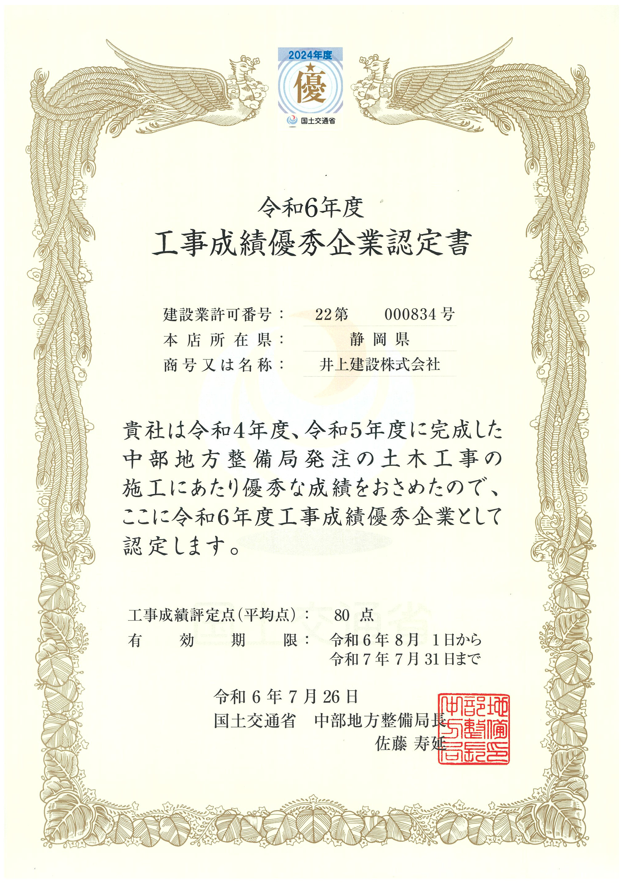 令和6年8月 令和4年・5年度 完成土木工事 国土交通省 令和6年度工事成績優秀企業認定