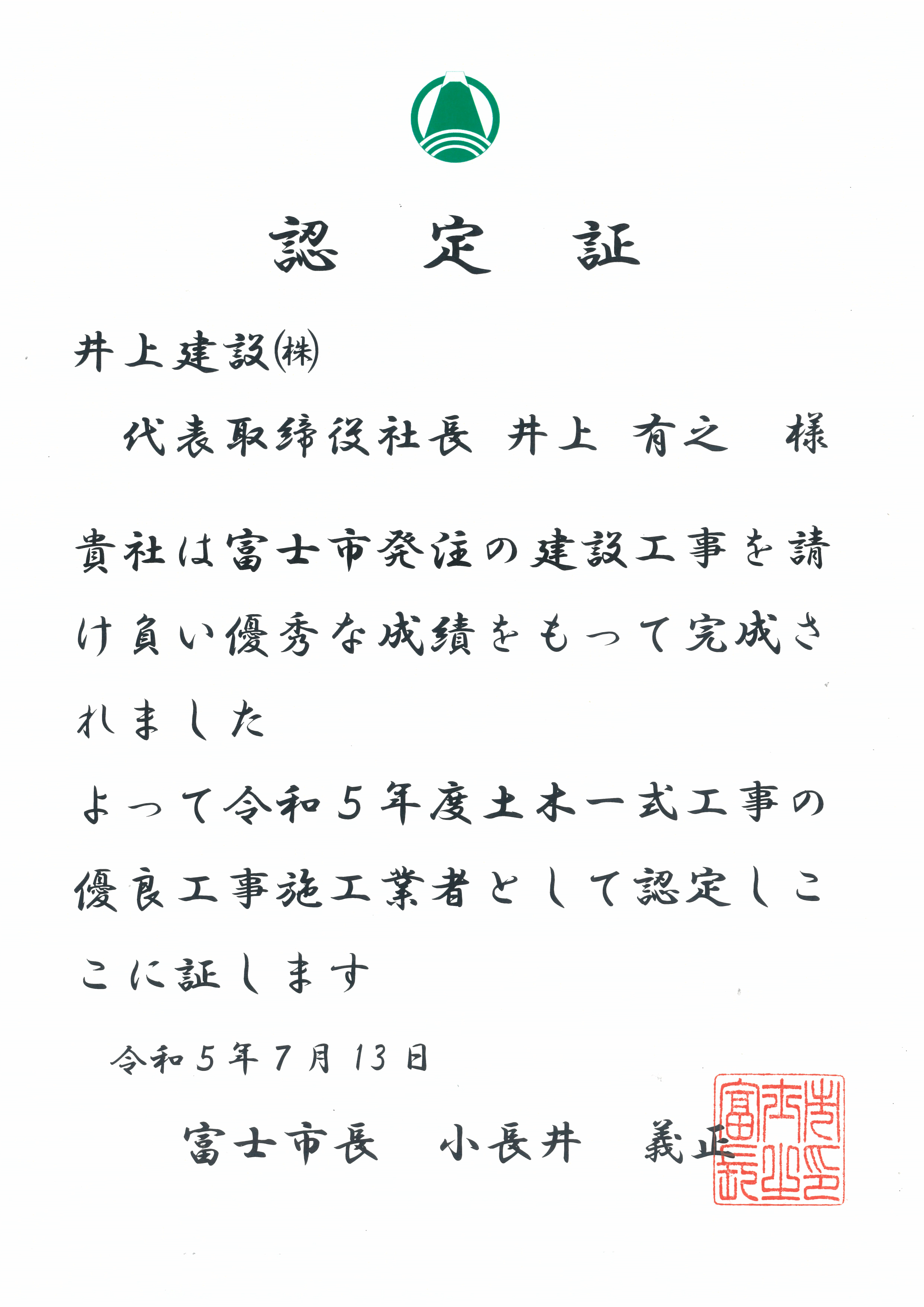 令和5年7月 令和4年度 土木一式工事 富士市 令和5年度土木一式優良施工業者認定